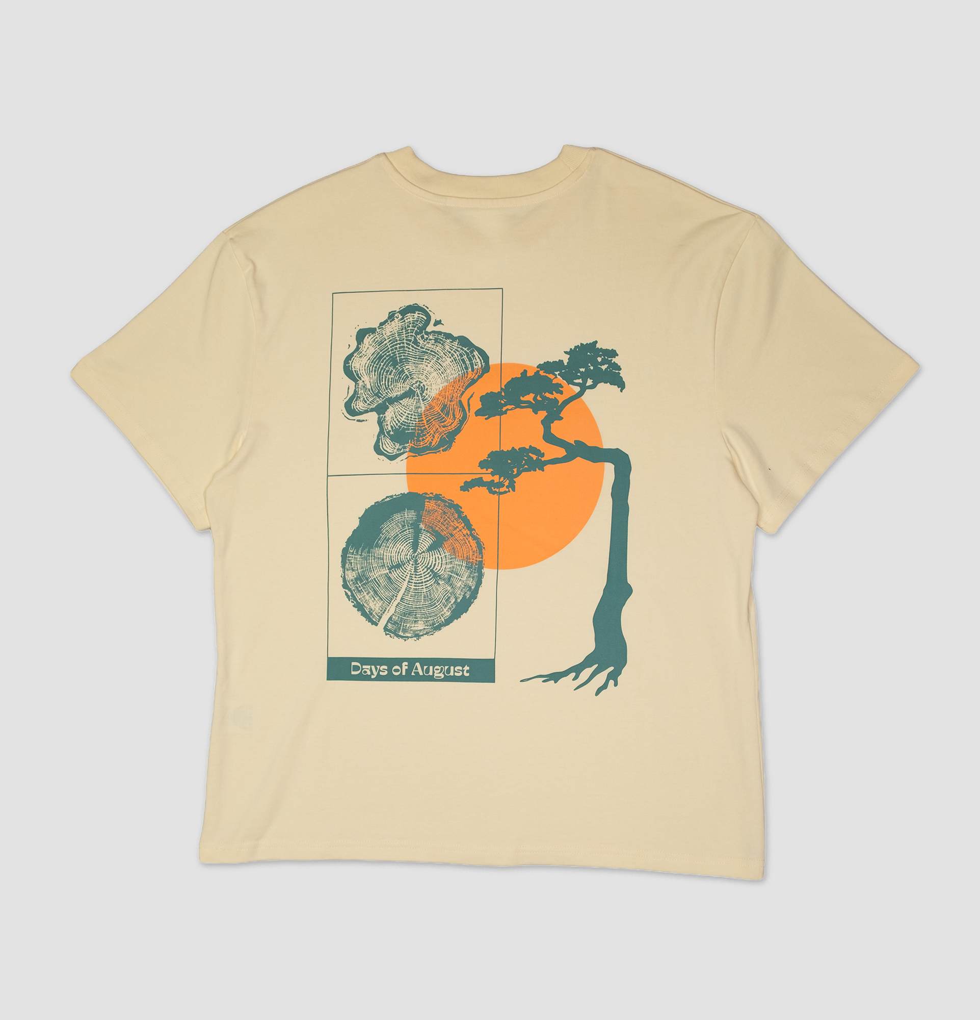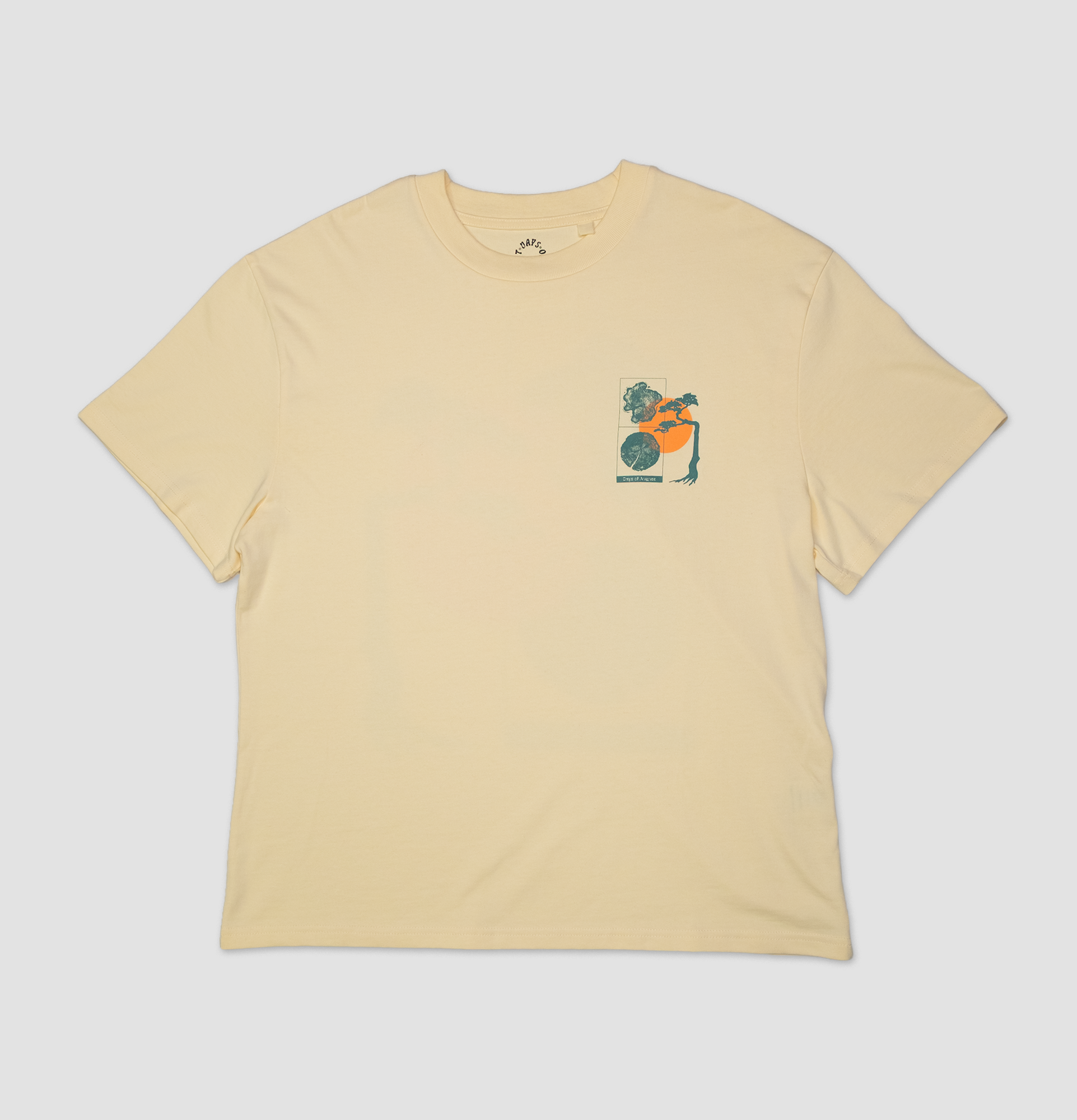 The Mydland T-shirt in faded yellow is made from 100% organic BCI cotton and features screen-printed graphics inspired by the Norwegian forest.